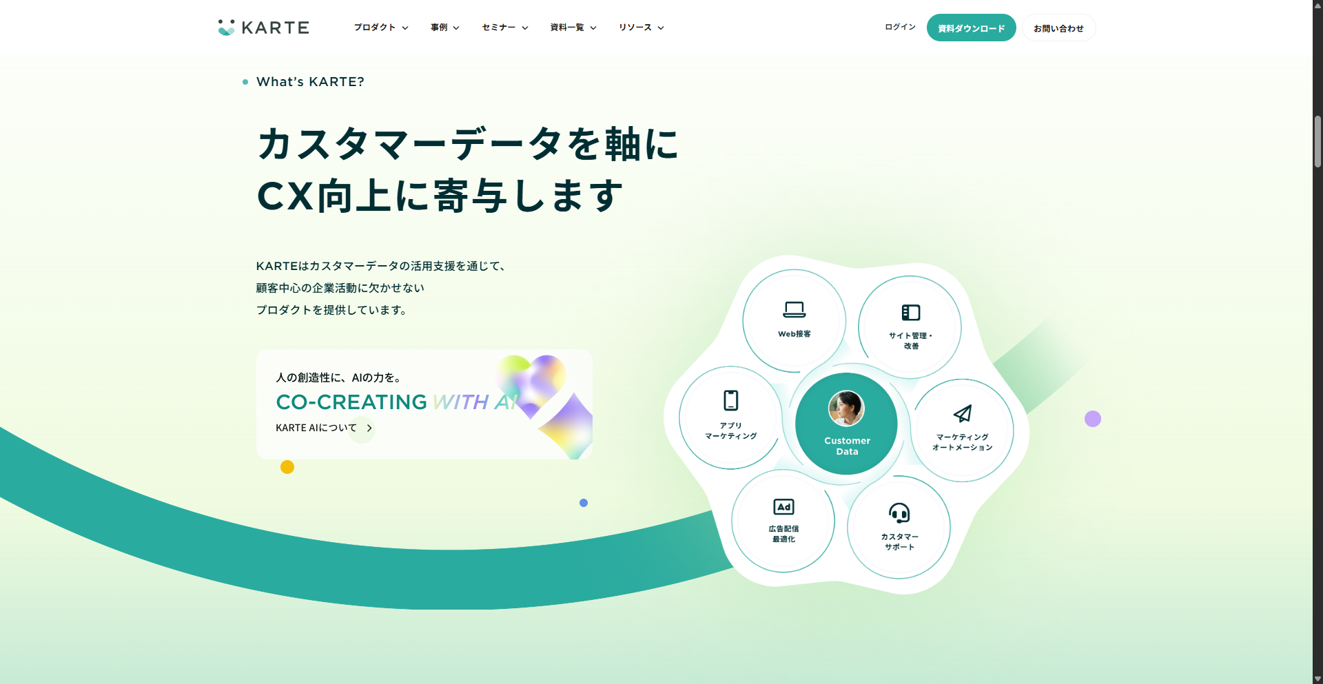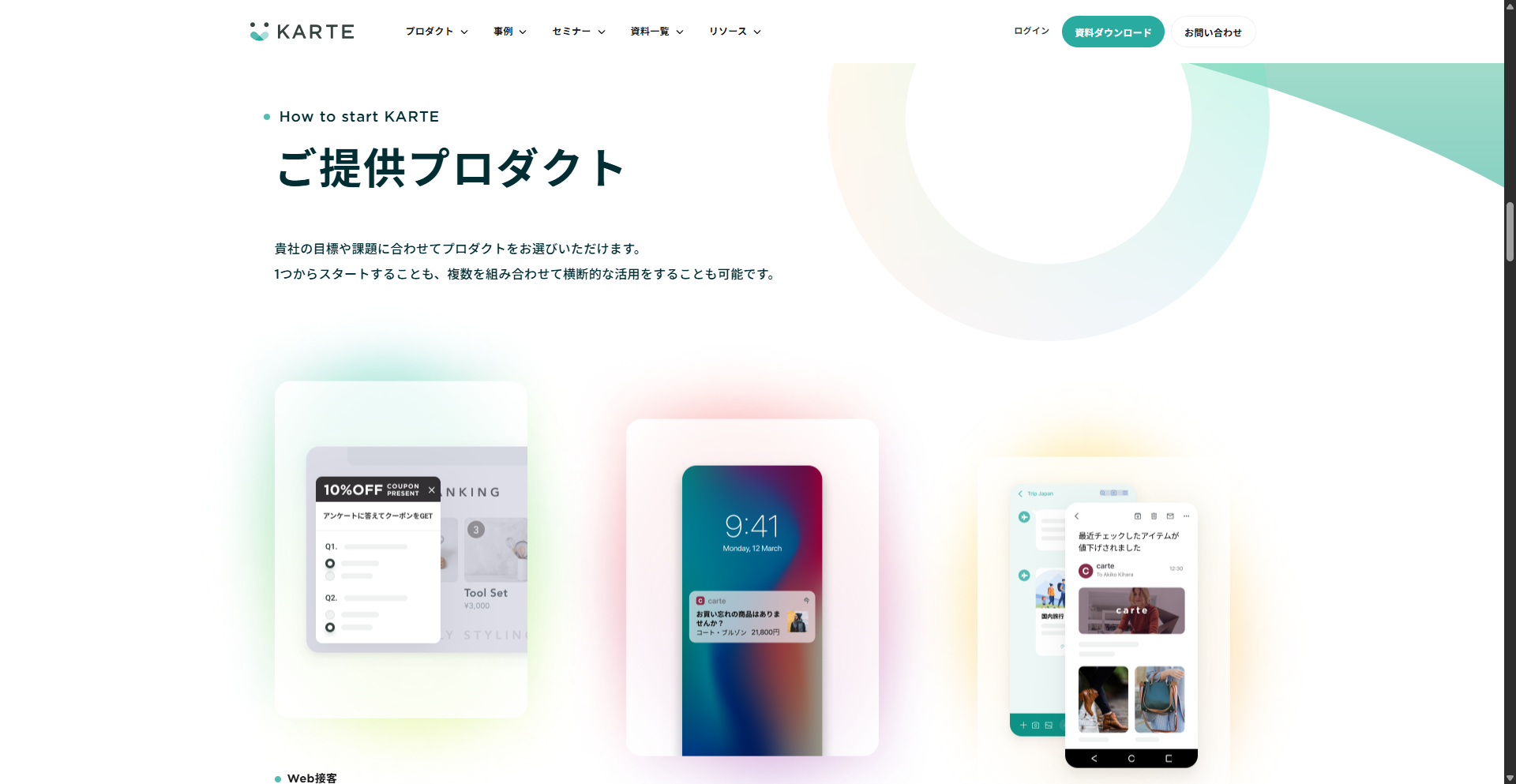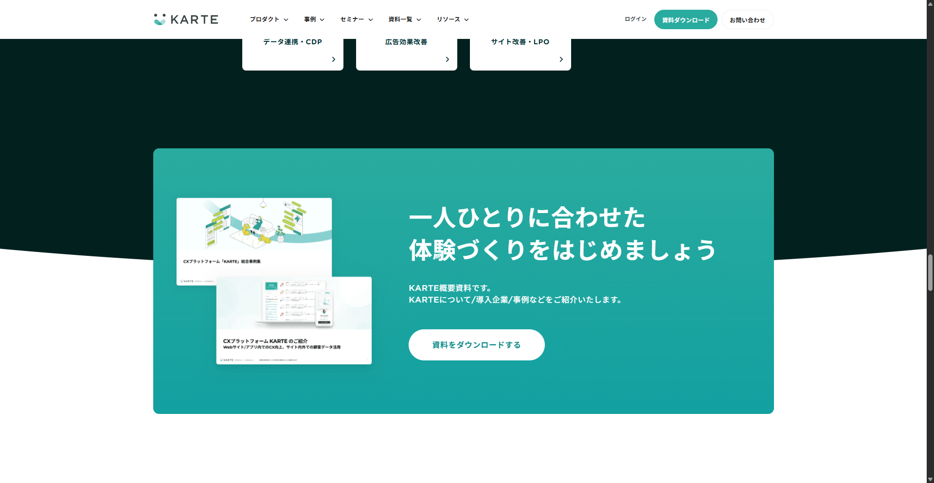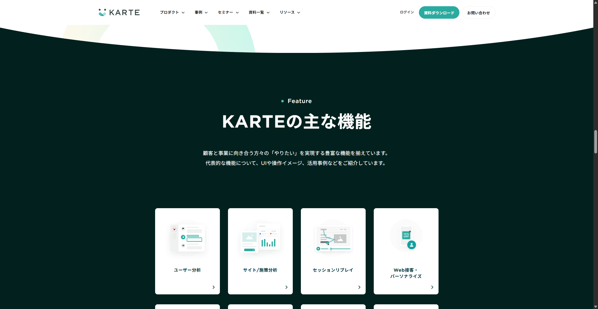 - ここも画面をいっぱいに使って画像を装飾、KARTEのサービスを包括的にイメージと共に示す役割