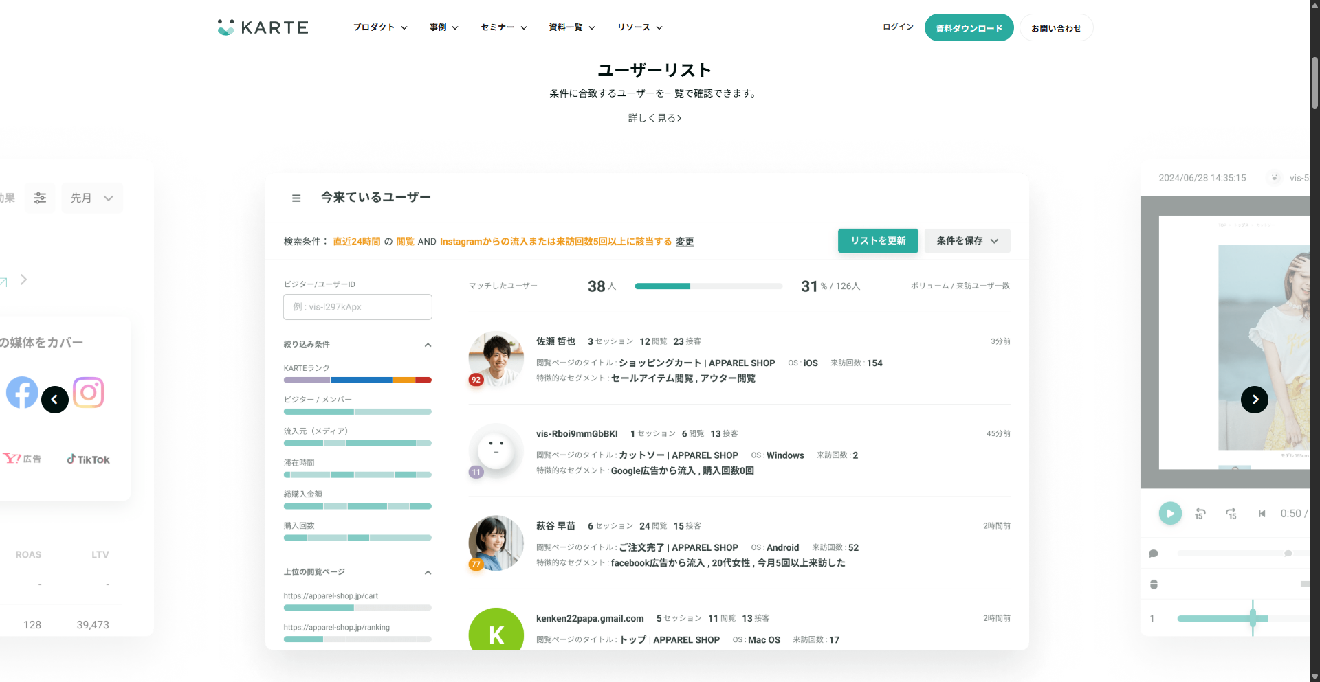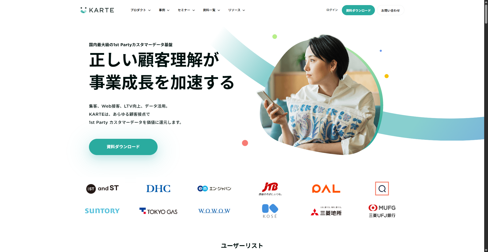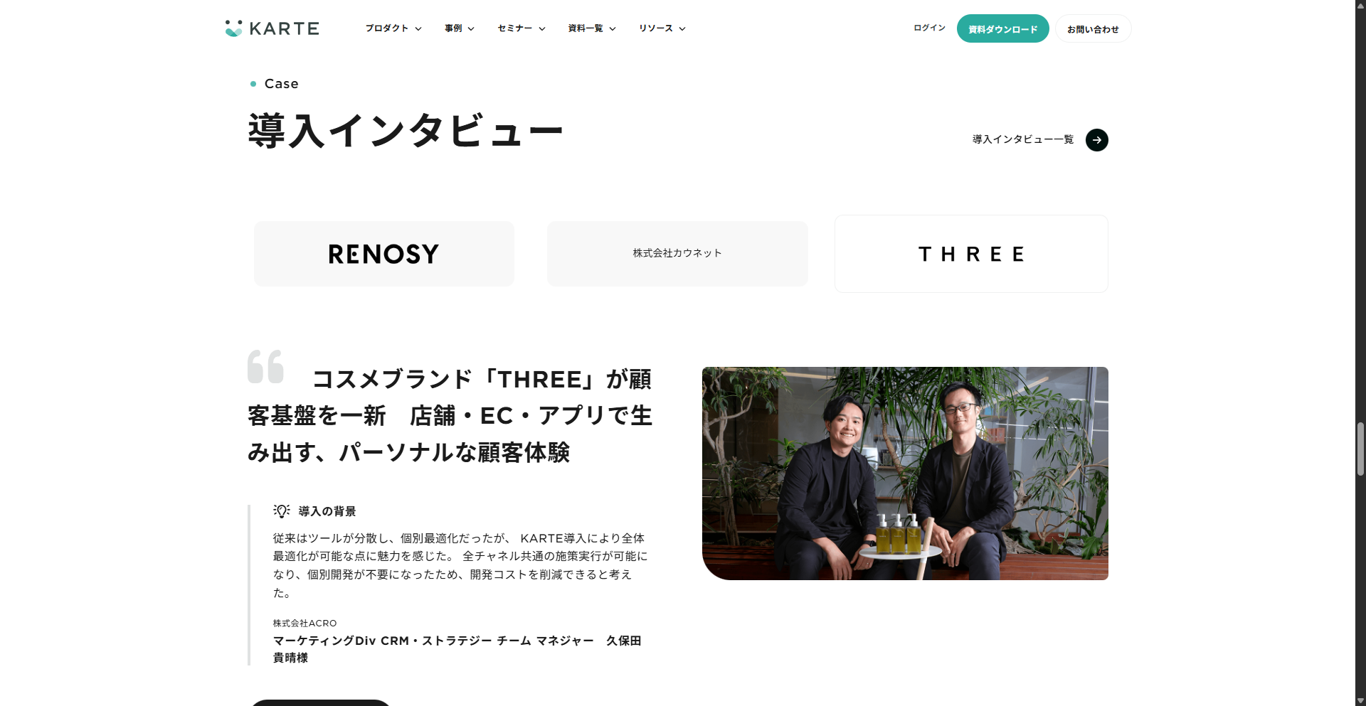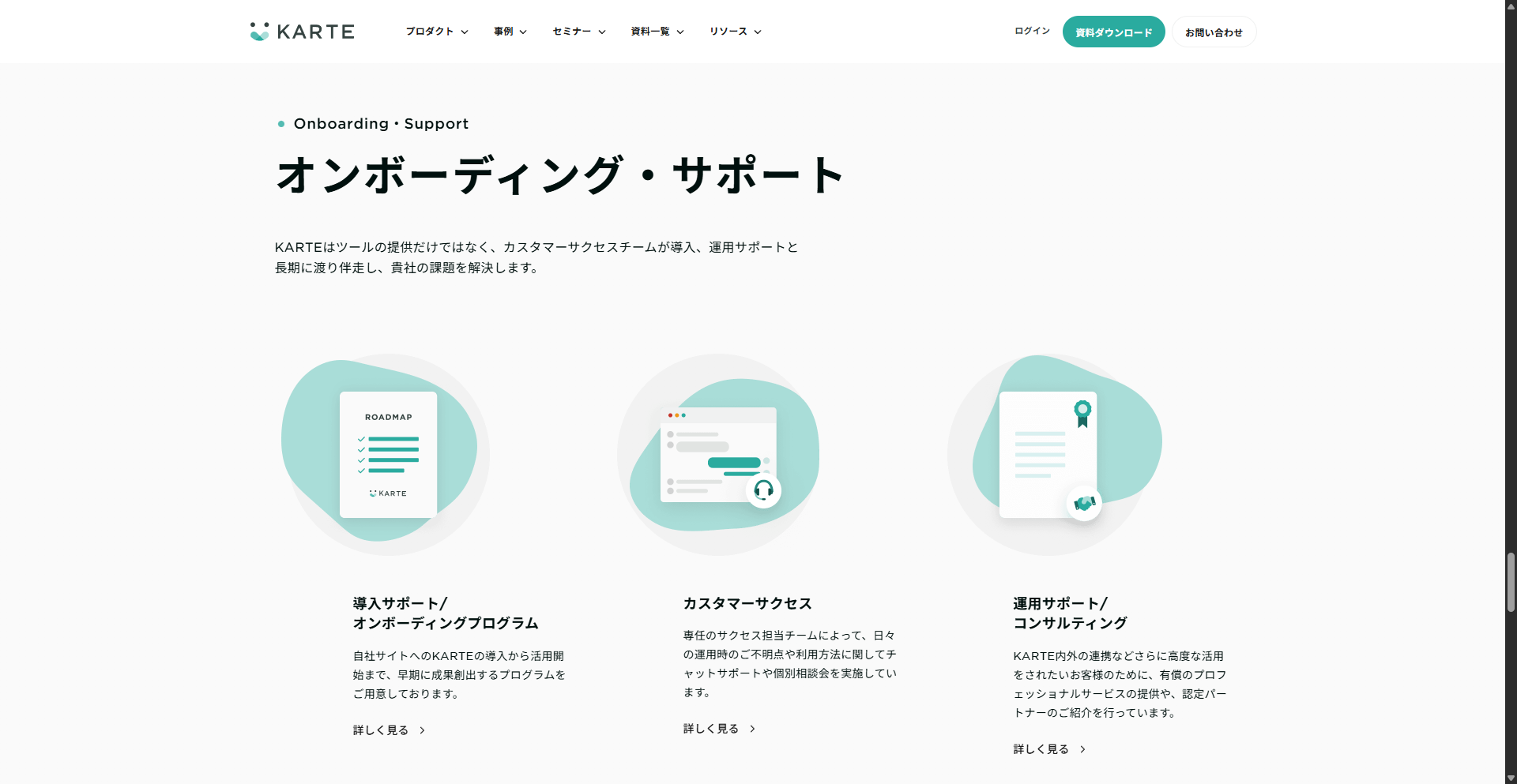 - ここも画面をいっぱいに使って画像を装飾、KARTEのサービスを包括的にイメージと共に示す役割